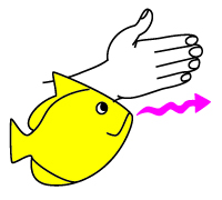 + Denk eraan om je duimen omhoog te houden. Ø Beweeg niet je vingers en je pols. Want dan lijkt het net alsof de vis achteruit zwemt.