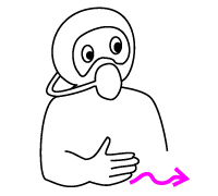 1. Hou je rechterhand plat met je duim omhoog en je palm naar je toe. 2. Beweeg je hele arm naar voren in een golvende beweging.