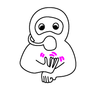 1. Hou je linker S- hand, palm onder. 2. Leg je rechter klauwhand met de palm boven op je S- hand. 3. Wiebel met de vingers van je klauw hand.